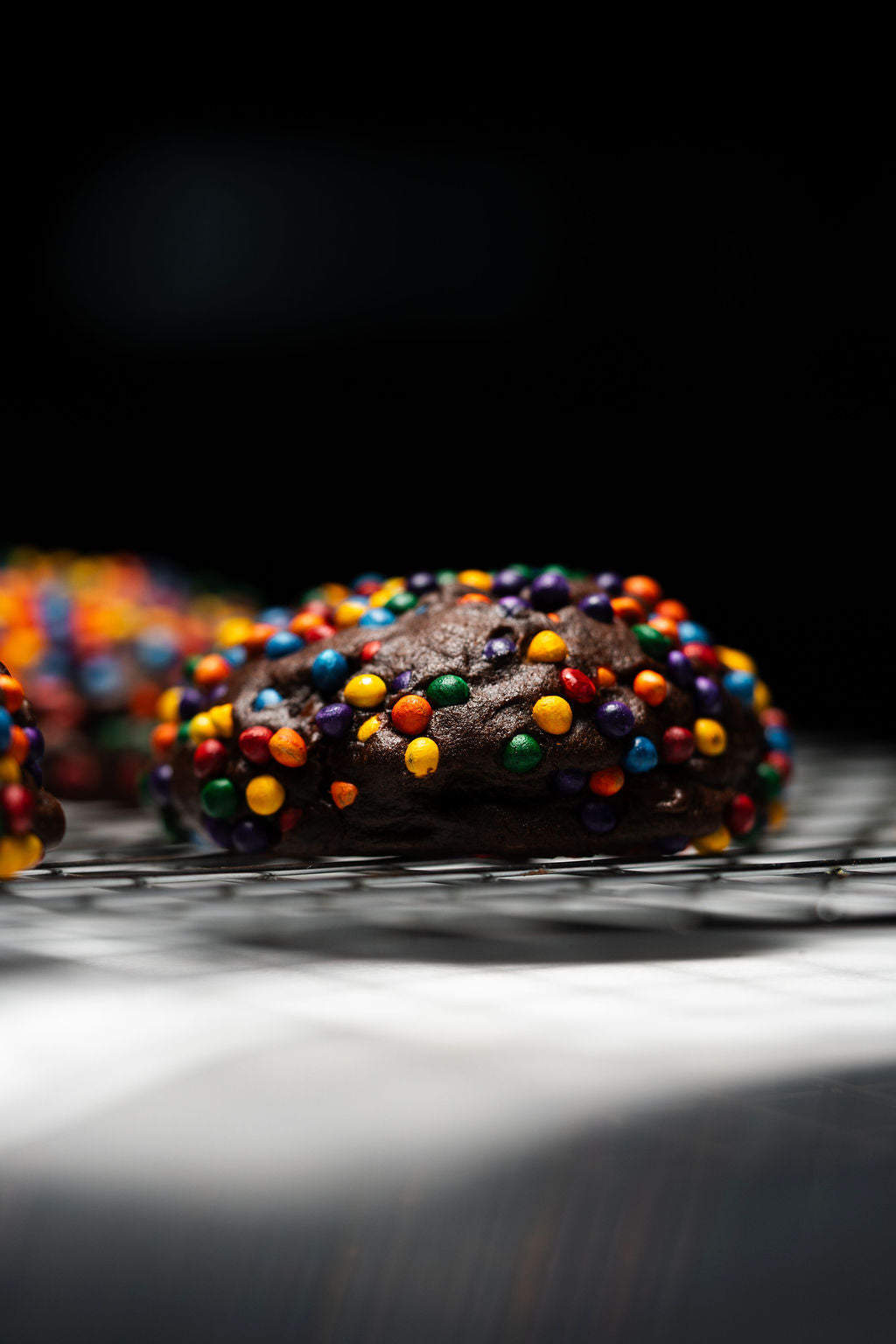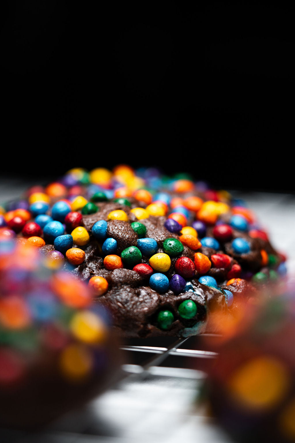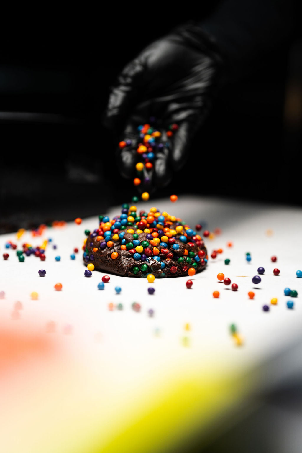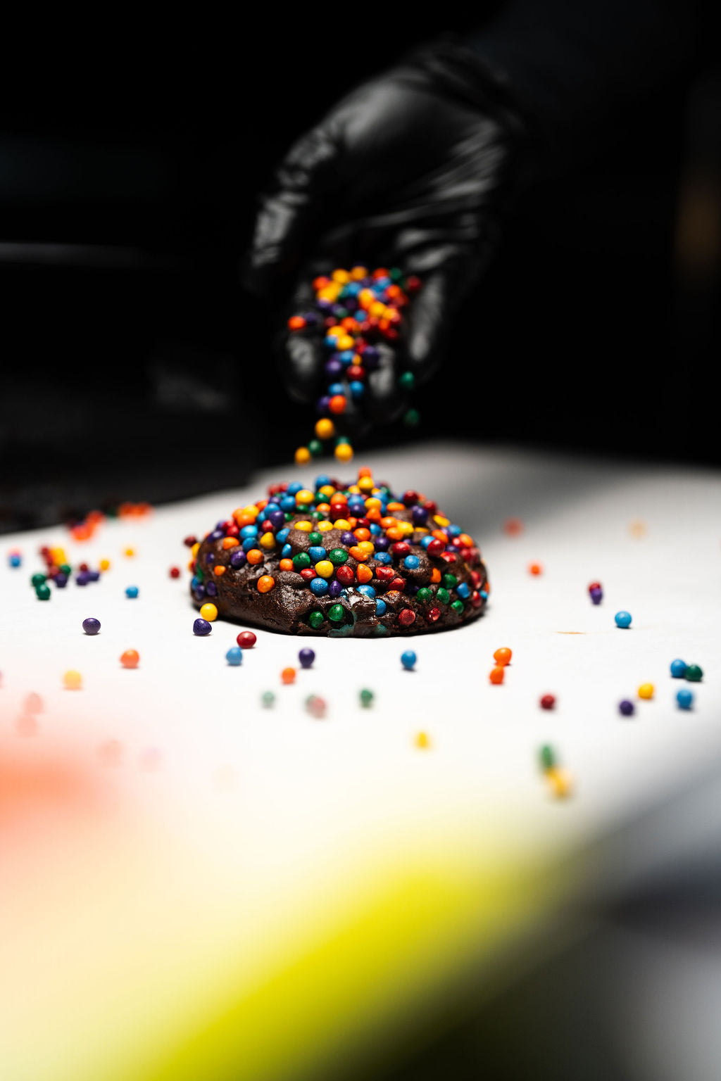 This Kookie features a rich chocolate cookie dough, mixed with semi-sweet chocolate chips, caramel bits, brownie chunks and Krammed with Cadbury Caramilk bars, topped off with rainbow chocolate bits.