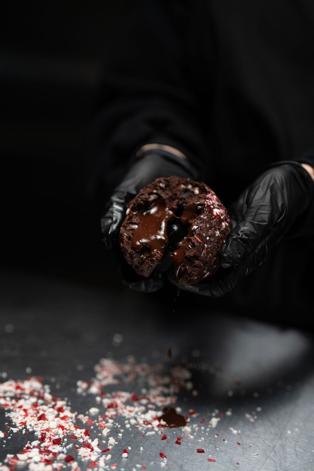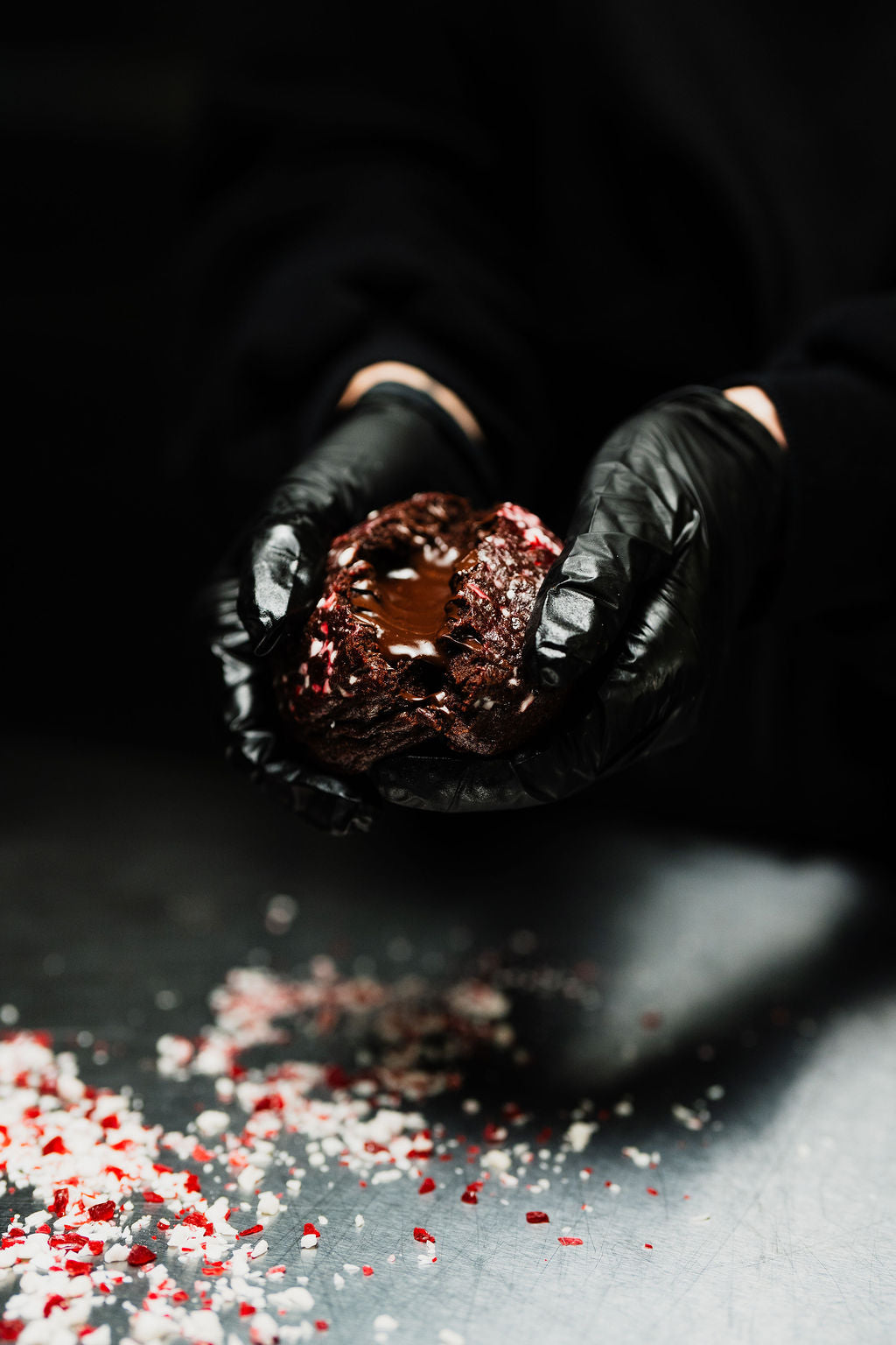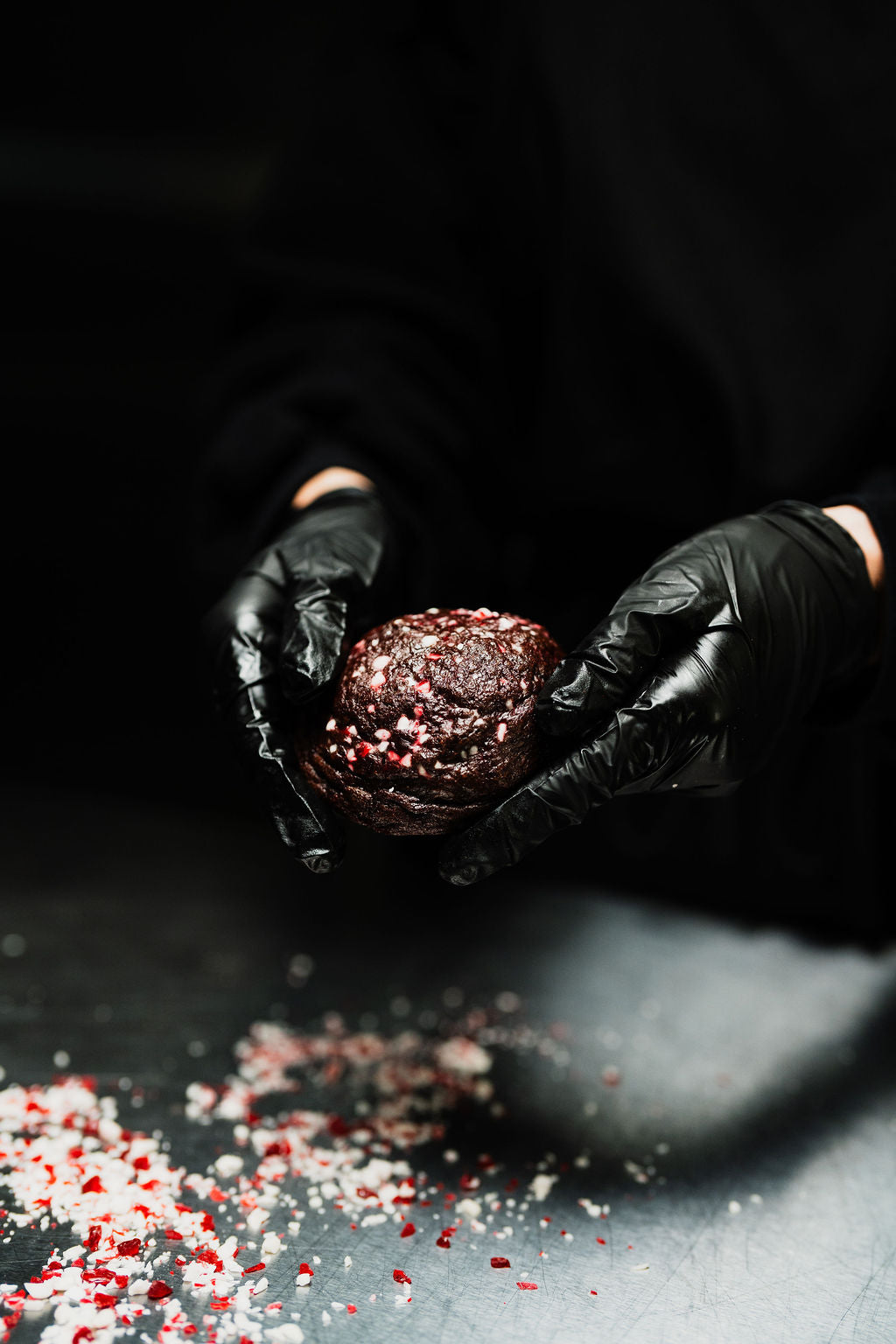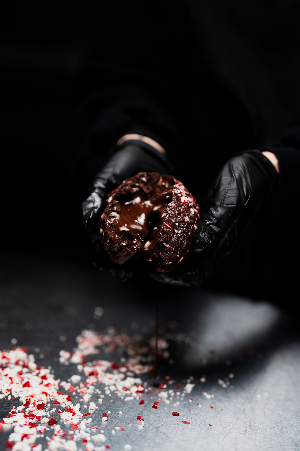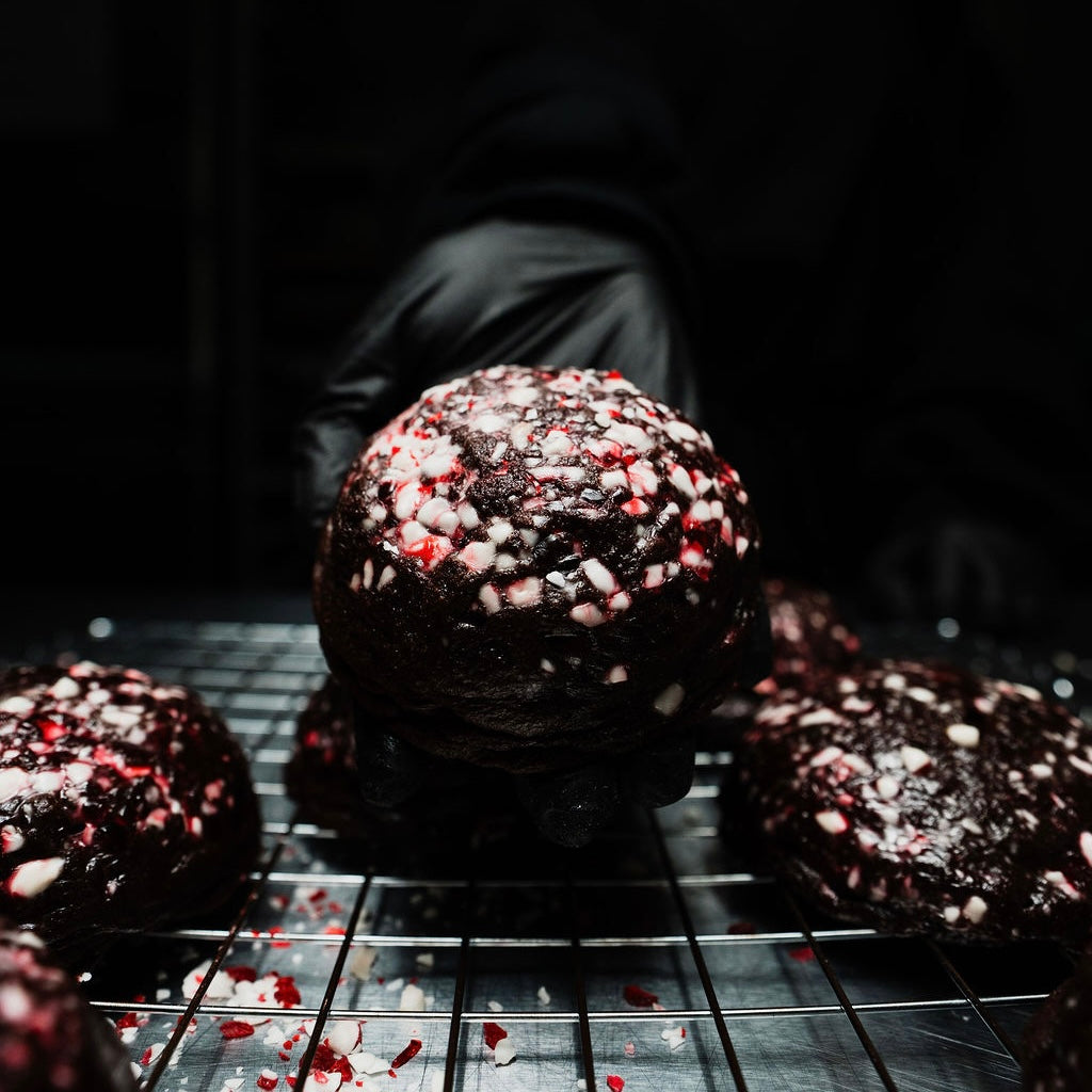 This December feature starts with a fudgey chocolate cookie dough, mixed with dark chocolate chips and Krammed with a peppermint chocolate ganache and topped with crushed candy cane pieces.