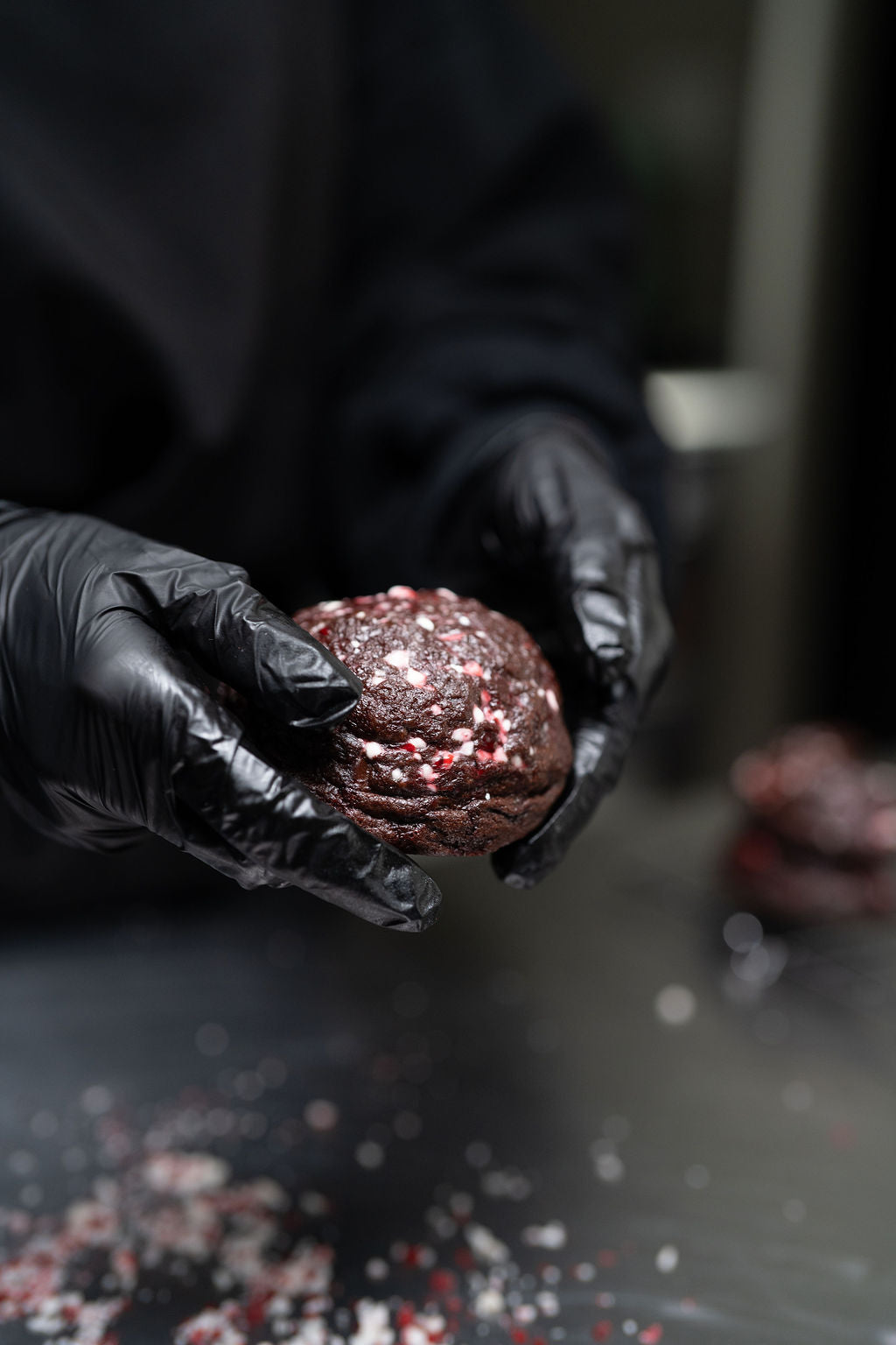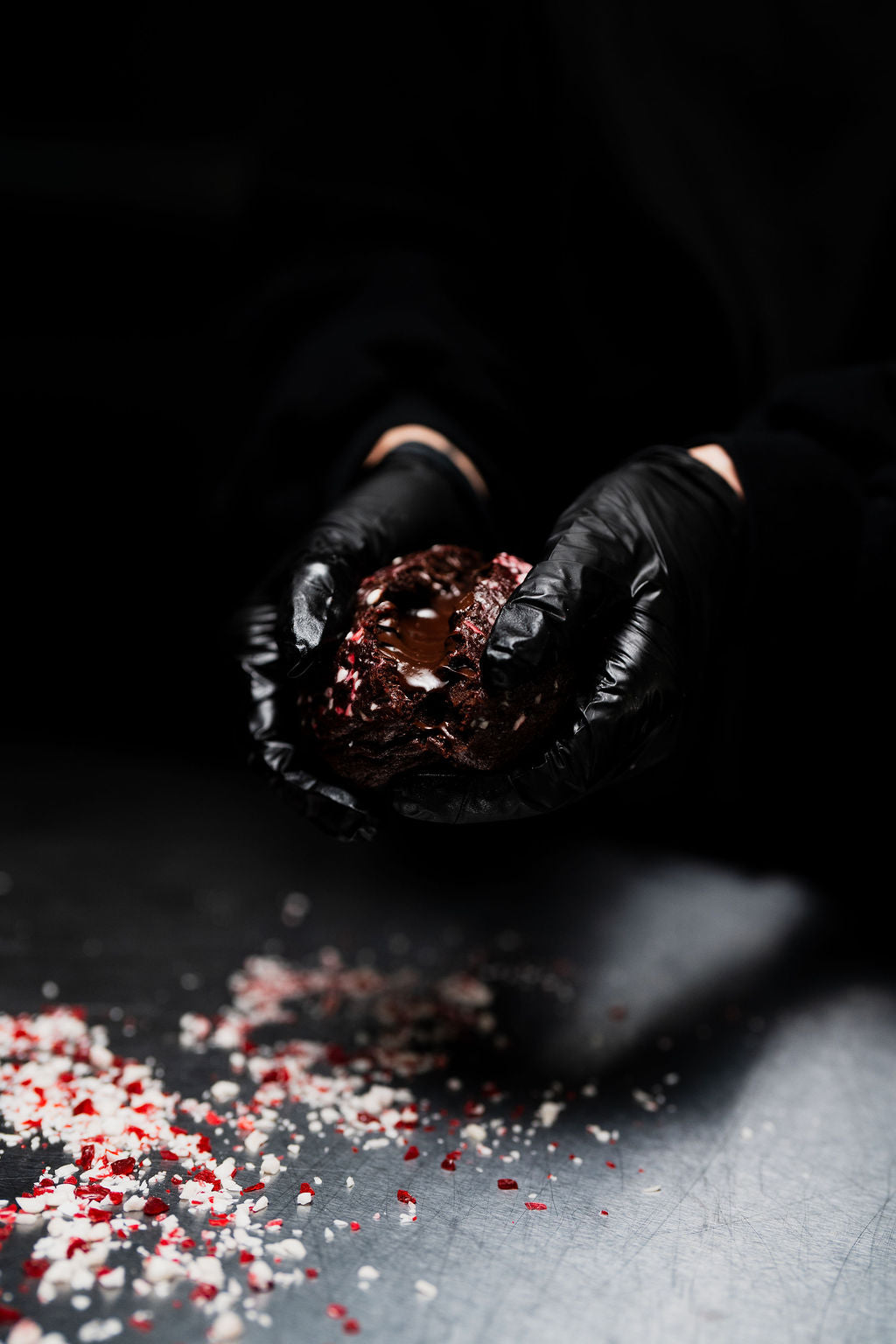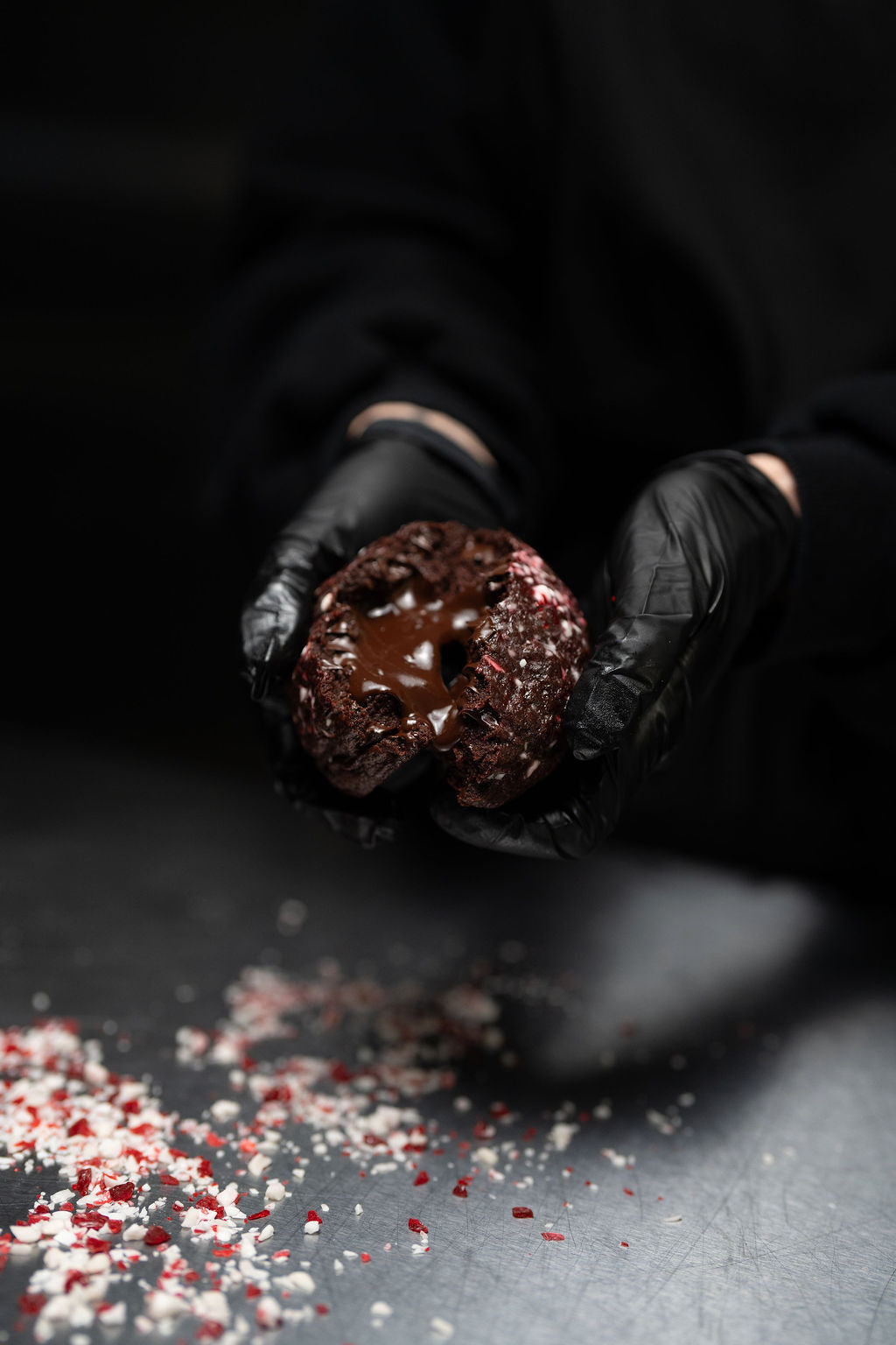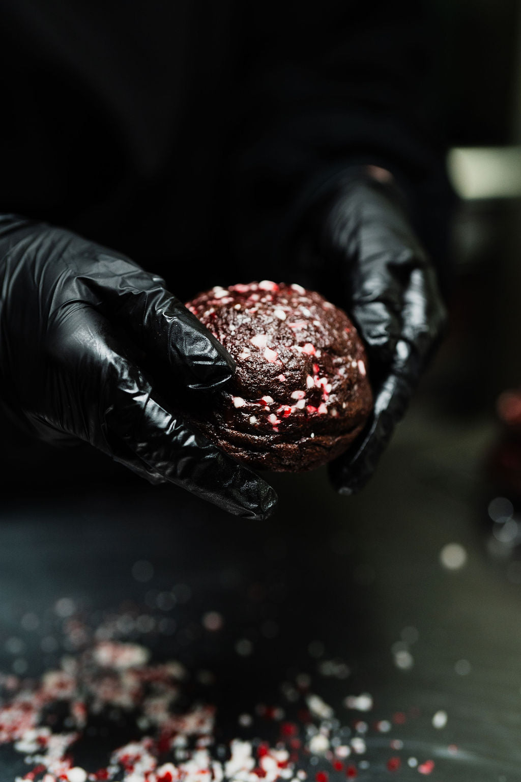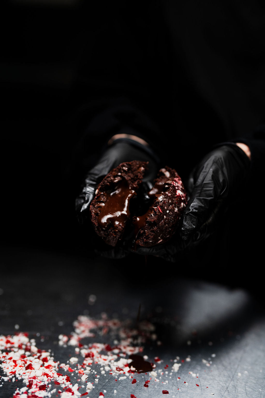 This December feature starts with a fudgey chocolate cookie dough, mixed with dark chocolate chips and Krammed with a peppermint chocolate ganache and topped with crushed candy cane pieces.