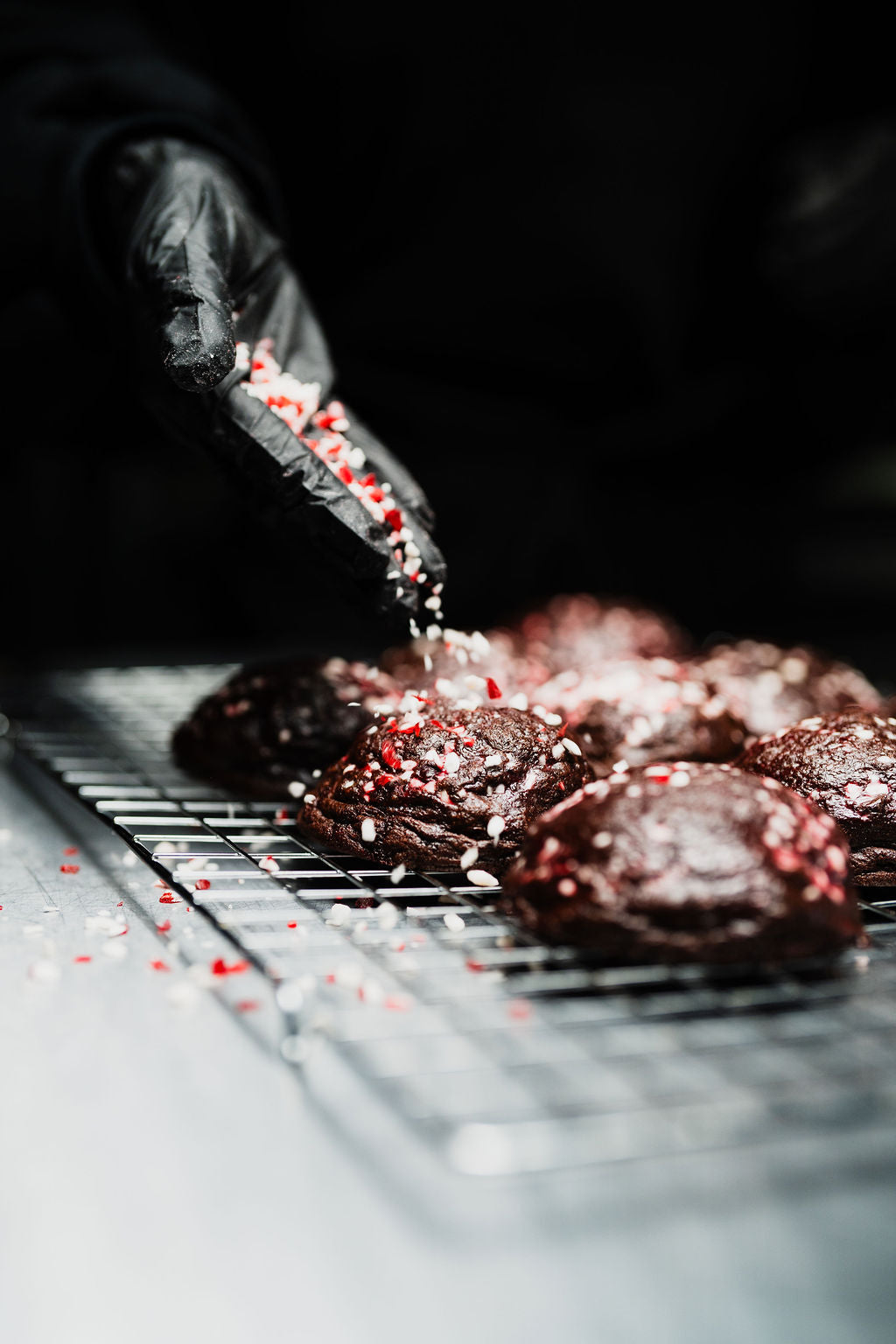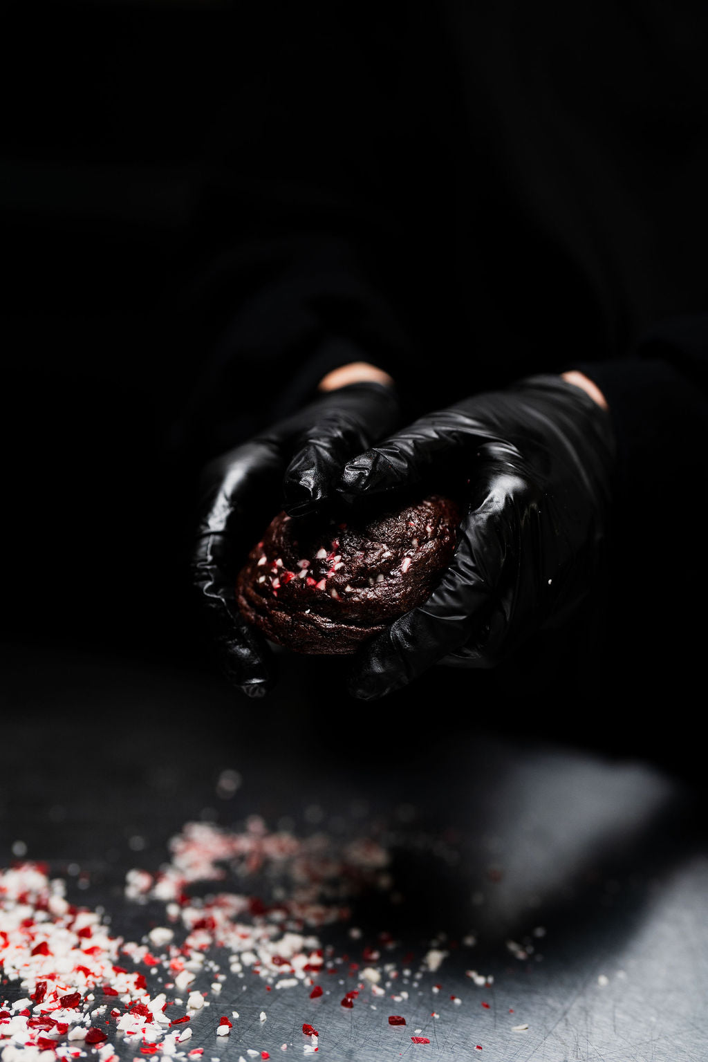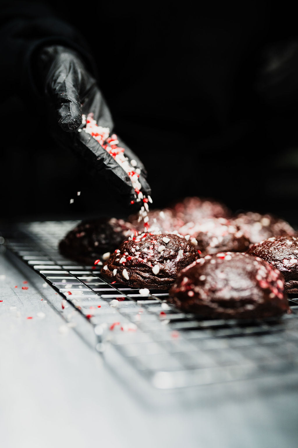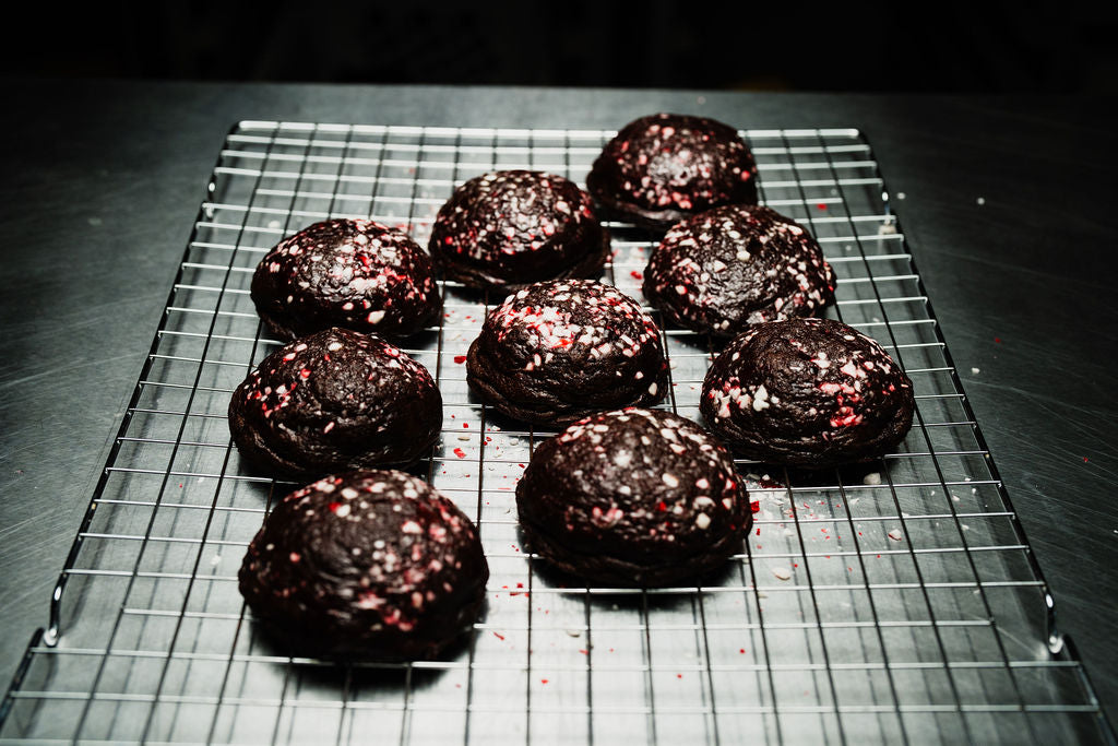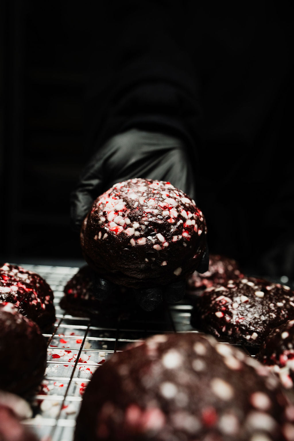 This December feature starts with a fudgey chocolate cookie dough, mixed with dark chocolate chips and Krammed with a peppermint chocolate ganache and topped with crushed candy cane pieces.