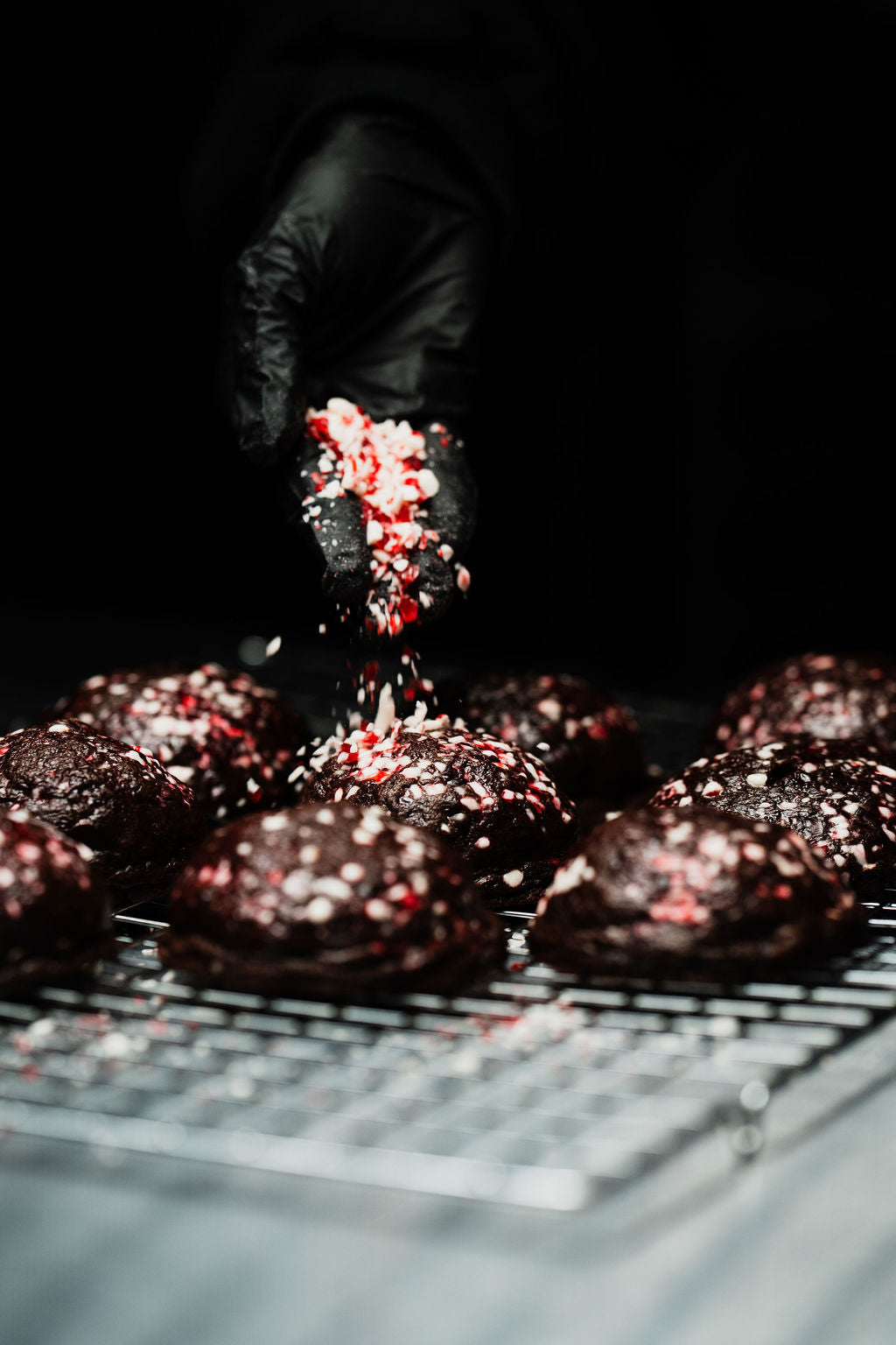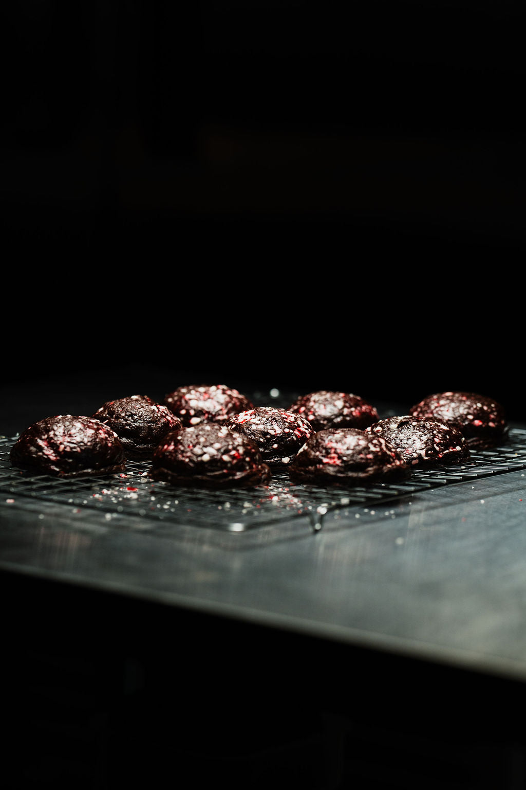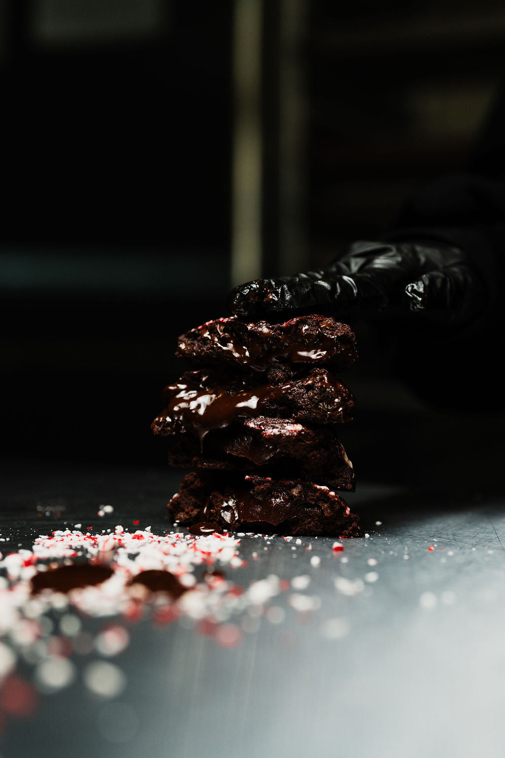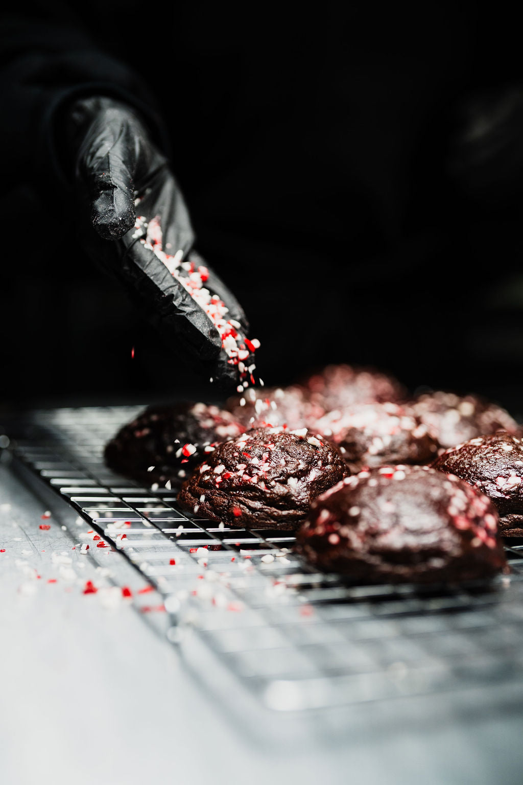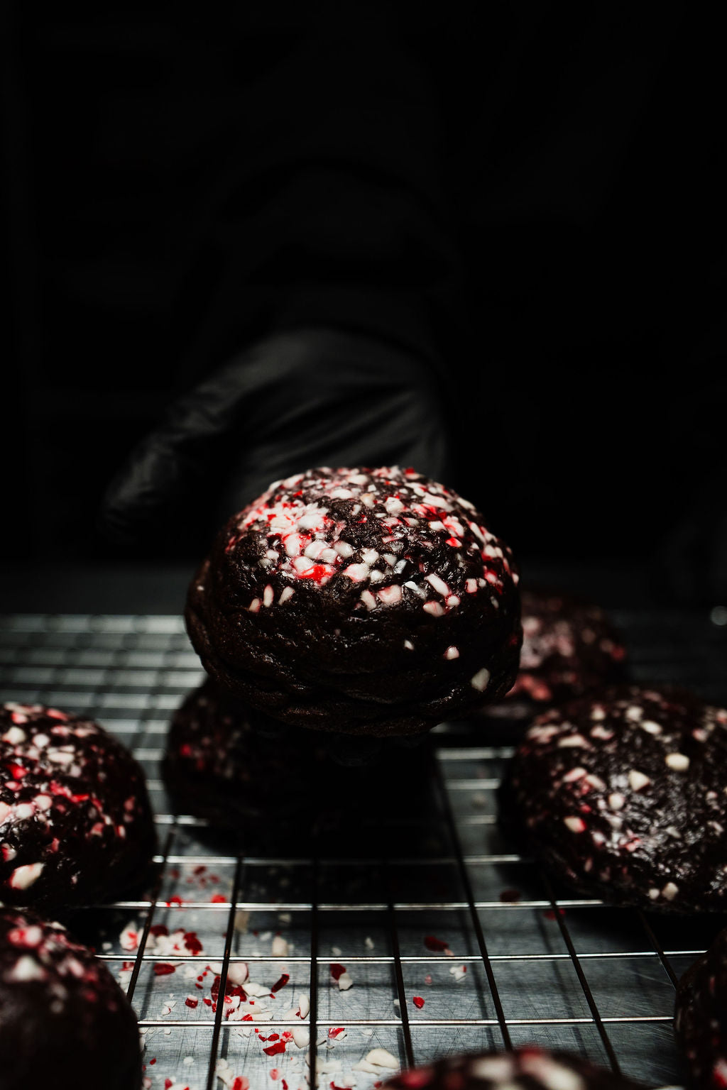 This December feature starts with a fudgey chocolate cookie dough, mixed with dark chocolate chips and Krammed with a peppermint chocolate ganache and topped with crushed candy cane pieces.