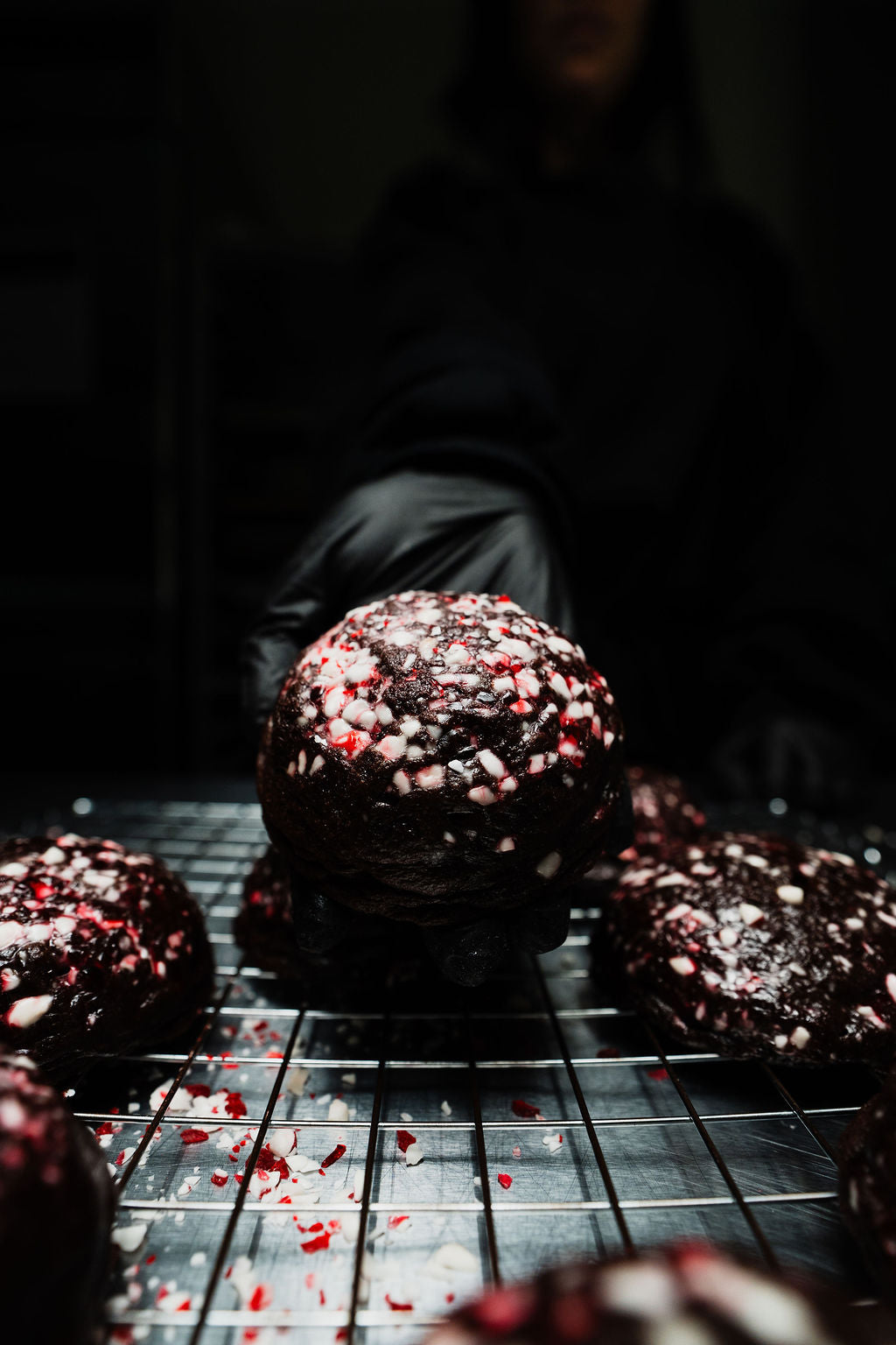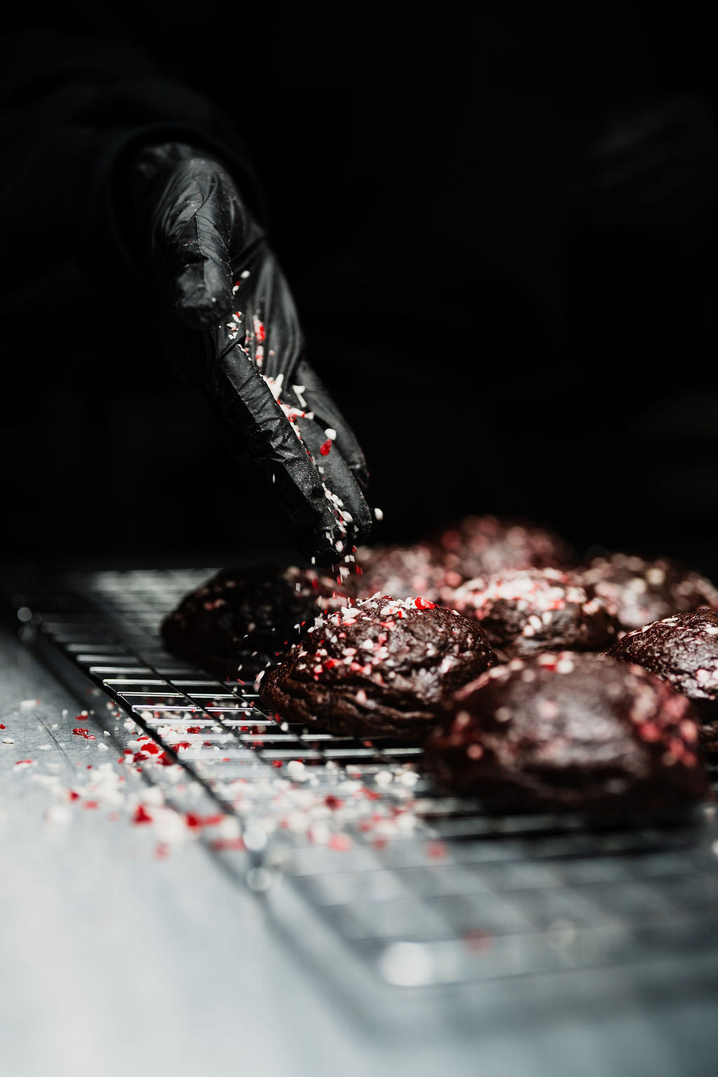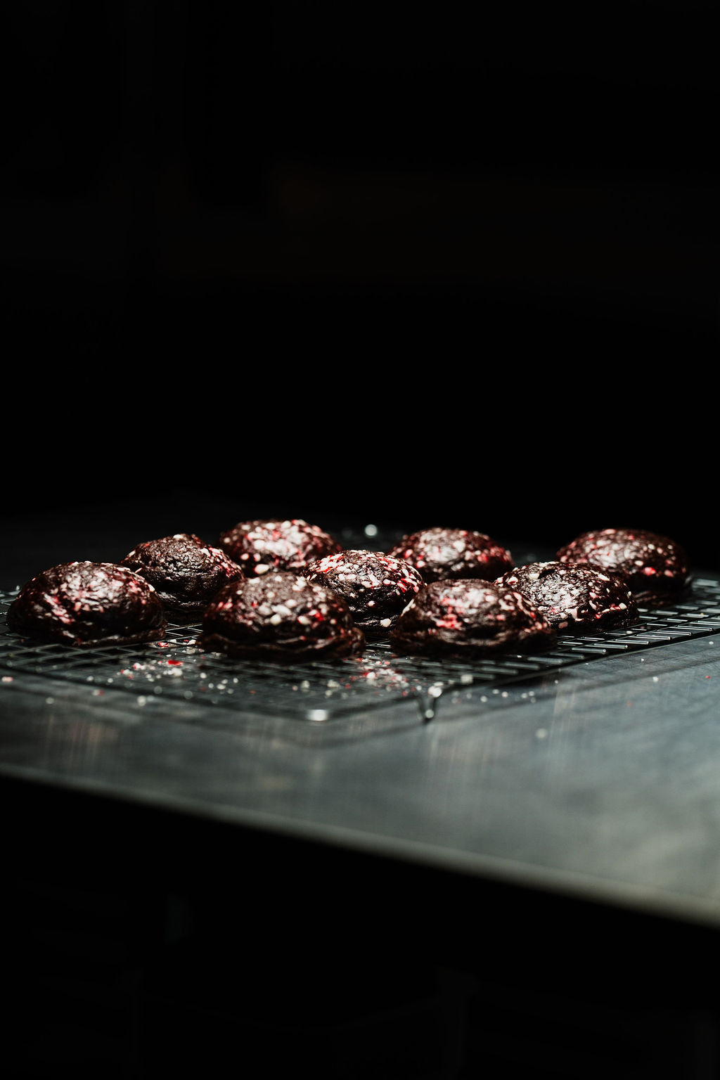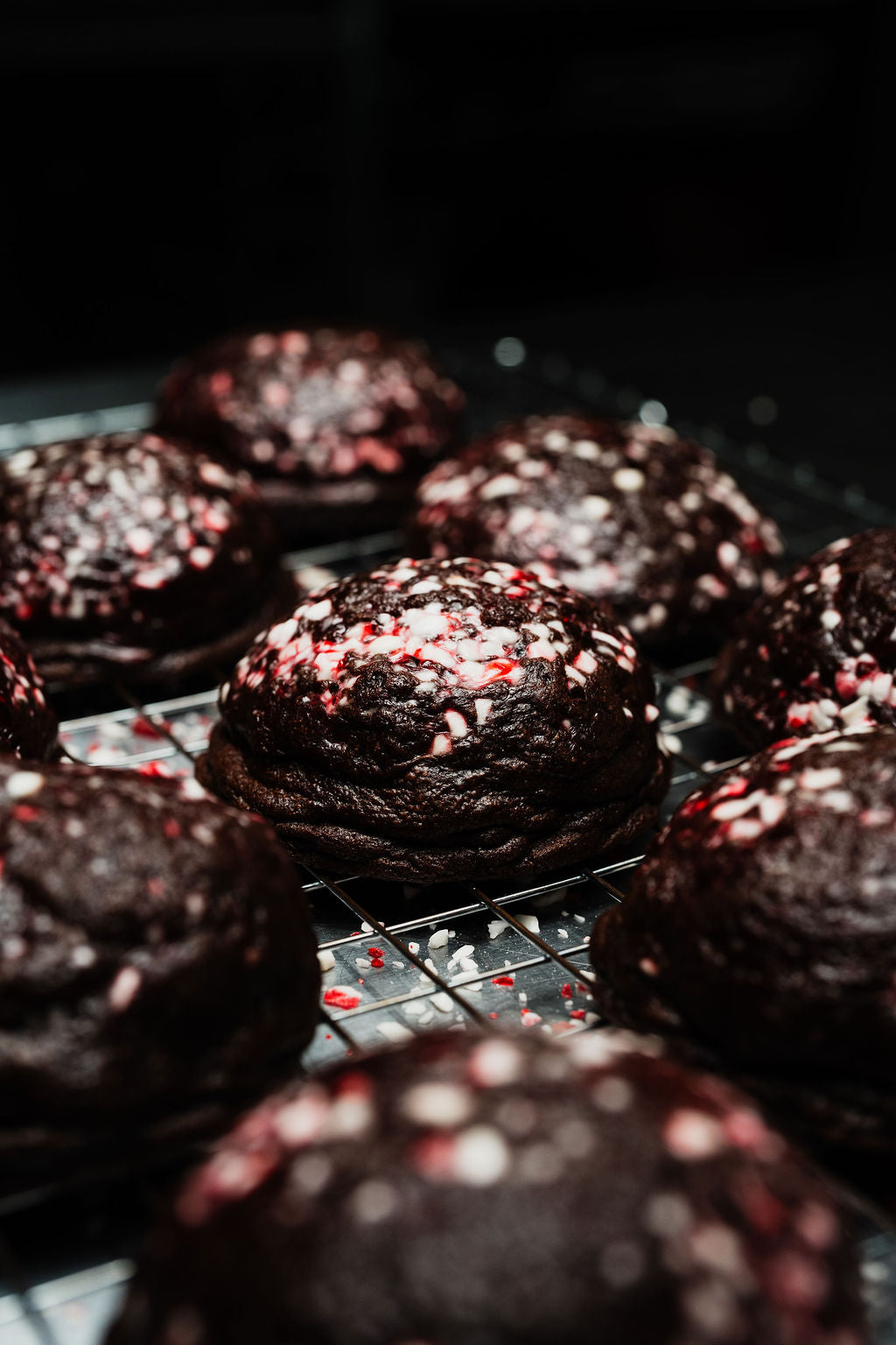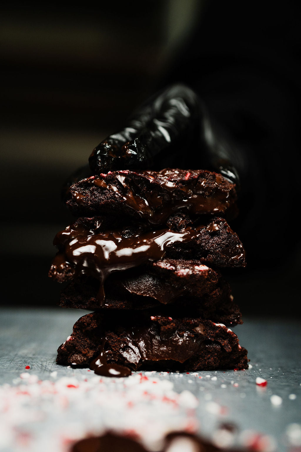 This December feature starts with a fudgey chocolate cookie dough, mixed with dark chocolate chips and Krammed with a peppermint chocolate ganache and topped with crushed candy cane pieces.