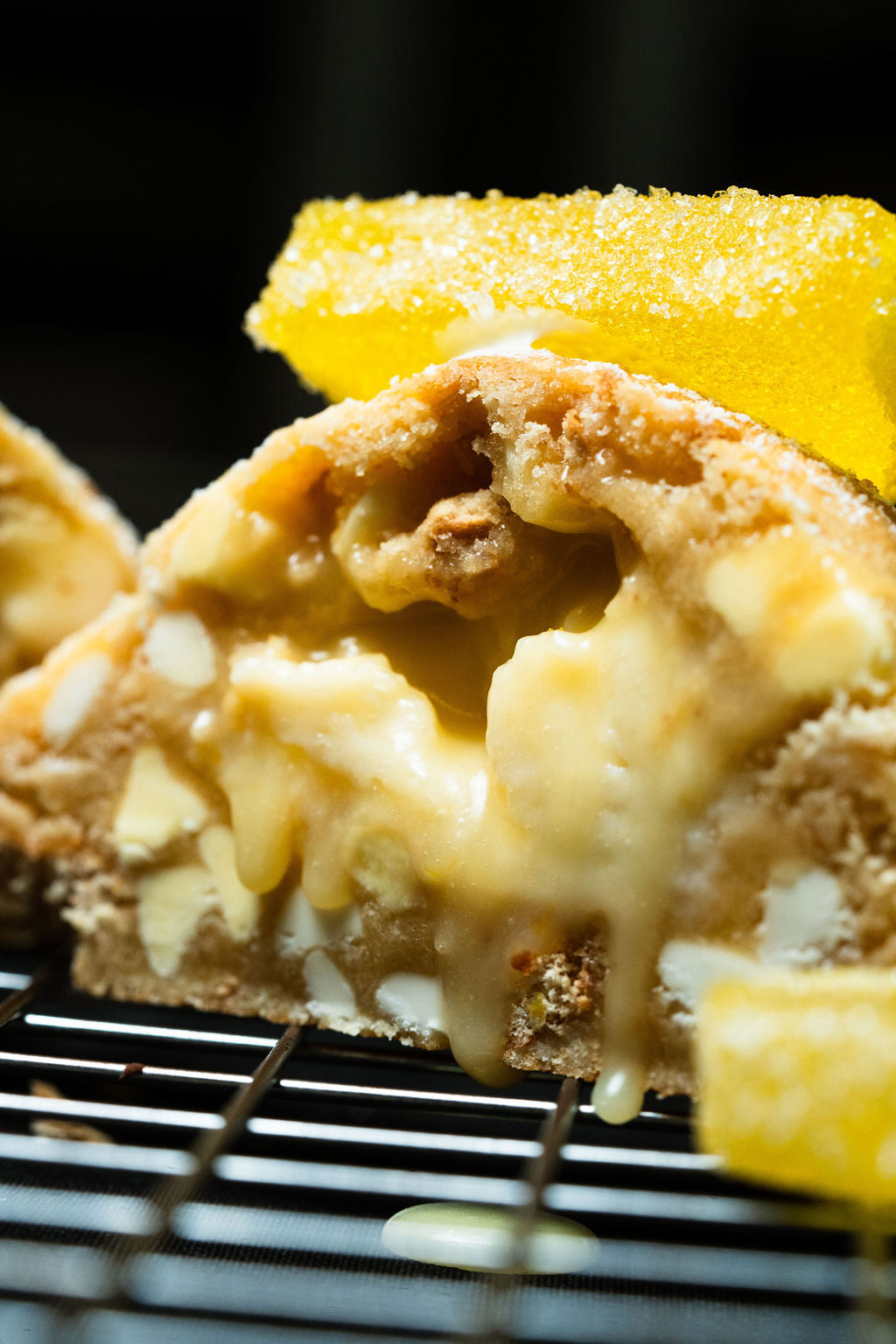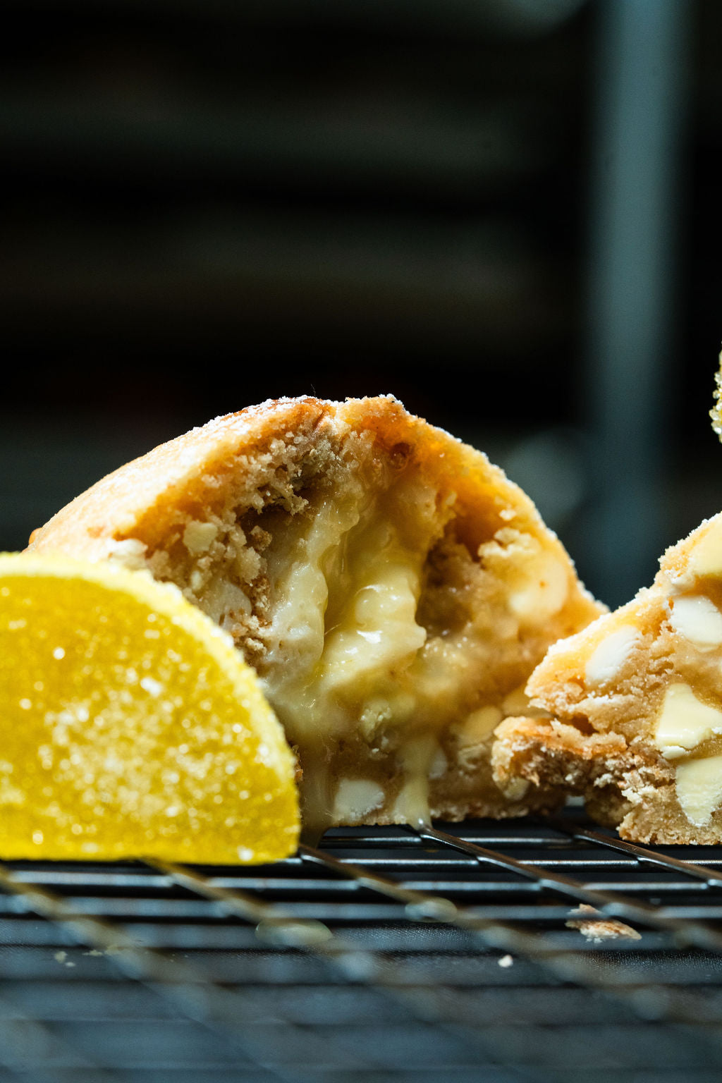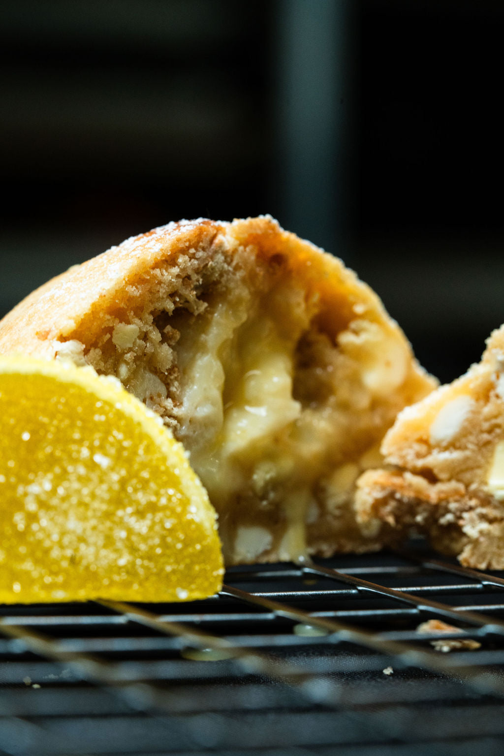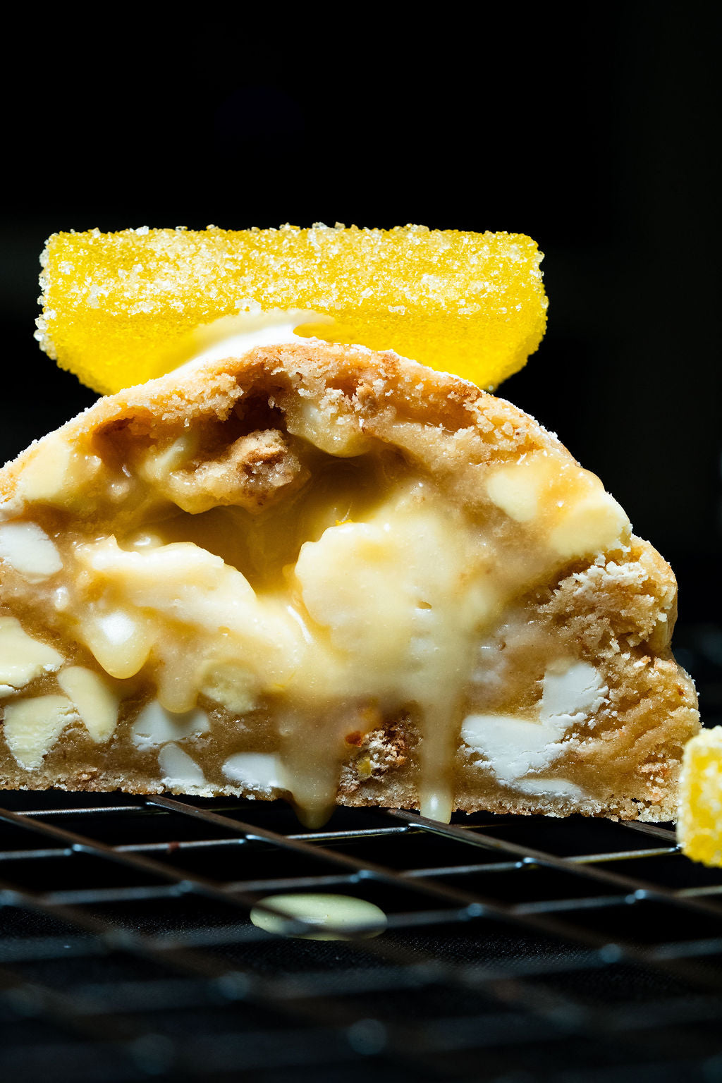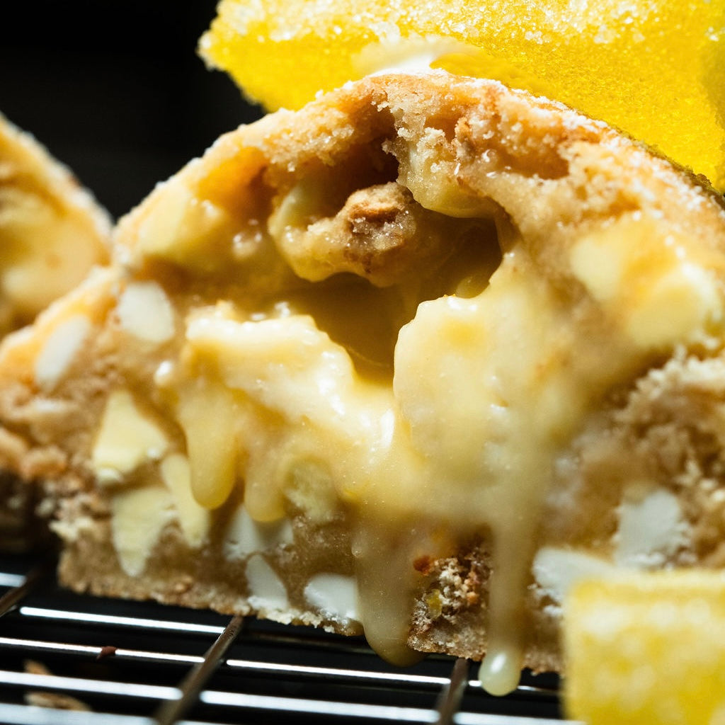 We finally did it with this one. Only took 6 years to perfect our lemon cookie and here it is. Featuring a lemon cookie dough, mixed with graham cracker chunks, white chocolate chips, and lemon chips, Krammed with a fresh lemon curd and a creamy smooth cheesecake, and then all dusted with icing sugar for that last and final touch.